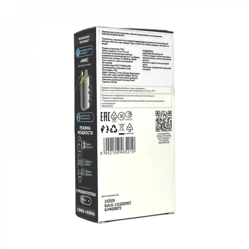 Технические характеристики WAKA BLAST 38000 Hard - Виноград грейпфрут + лимонная содовая